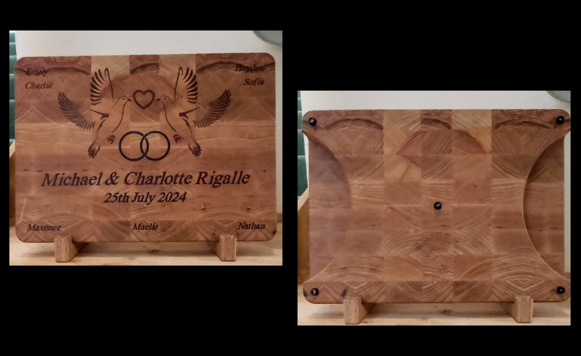 All boards have an 8mm deep end grain wooden inlayed design which ensures your chosen image and or text will never fade or wear away. Every board has 5 rubber feet attached with stainless steel screws to avoid your board moving around on your surface. All boards have plate cut-outs to position your plate underneath the board enabling you to slide your chopped food easily onto your plate. The plate cut-outs also provide ease of lifting the board incase you would like to use it as a cheese board, charcuterie board or just as a serving board.
